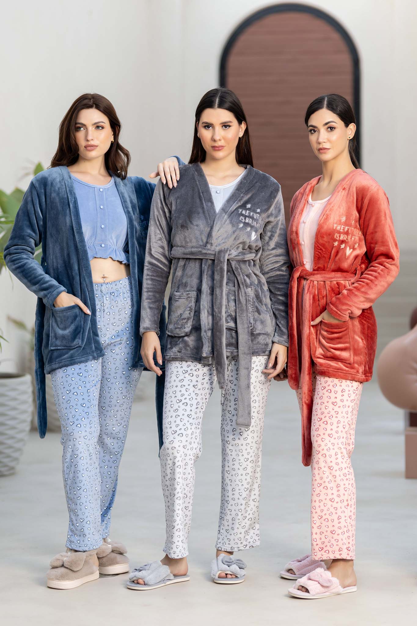 A cozy three-piece winter homewear set featuring a soft belted robe, heart-patterned pants in matching tones, and a simple inner top. Available in three robe colors: blue, grey, and burgundy. A playful yet elegant design perfect for relaxed moments at home.